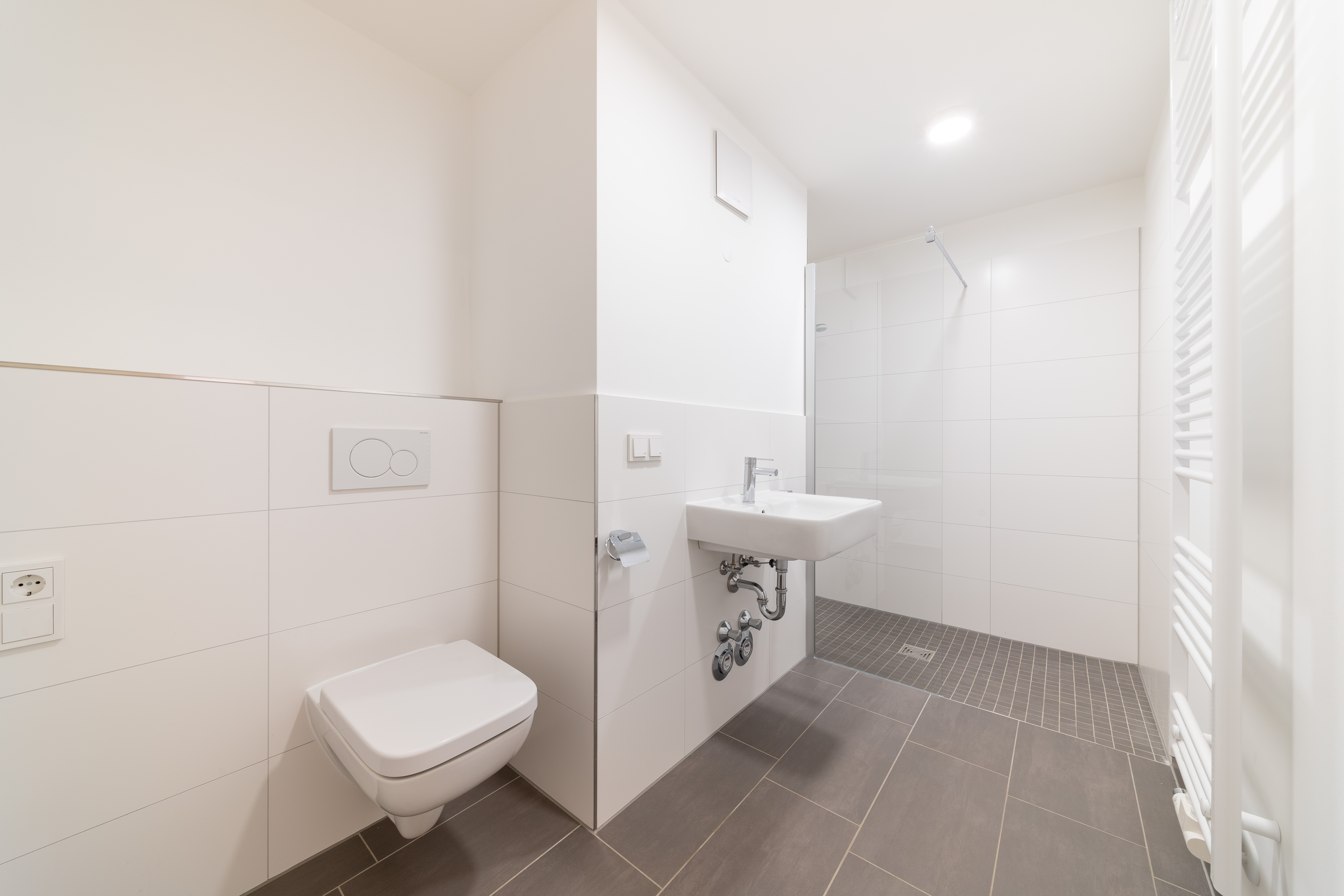 Die Ausstattung im Bad umfasst eine moderne Duschkabine. Die Bodenbeläge bestehen aus hochwertigem Vinyl und Fliesen, die sowohl funktional als auch ästhetisch ansprechend sind. Die Qualität der Ausstattung ist gehoben, was sich in der Auswahl der Materialien und Verarbeitung zeigt. Das Bad strahlt somit eine gewisse Eleganz aus und bietet eine angenehme Atmosphäre für die tägliche Körperpflege. Bitte beachten Sie, dass die im Inserat enthaltenen Bilder Referenzfotos von vergleichbaren Objekten darstellen.